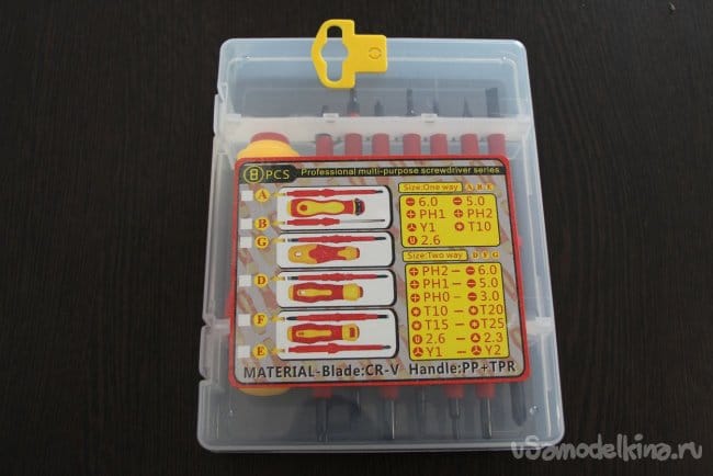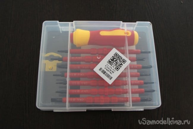 Коробка сделана из плотного, крепкого, прозрачного пластика. Защелки держат уверенно, отвертки сидят в своих пазах плотно.