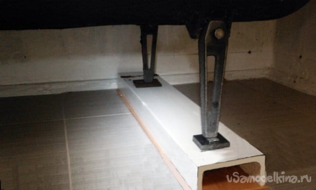Замазаны дыры и покрашены стены ниже ванны, пол выложен плиткой, определено место под подставки- швеллеры, вырезаны прокладки из старого линолеума. Подставки швеллеры выкрашены в белый цвет. Все установлено на свои места и установлена ванна.