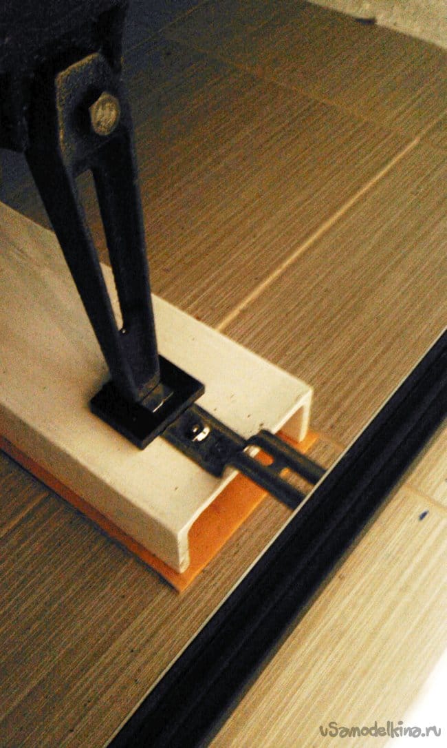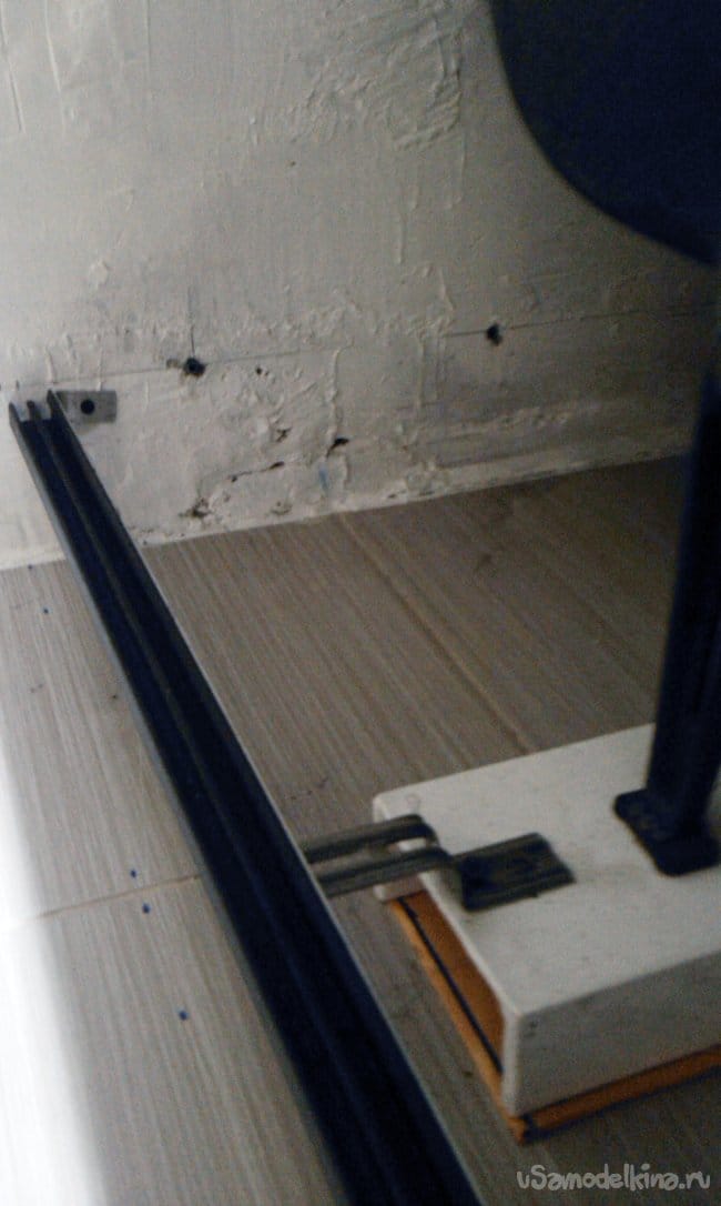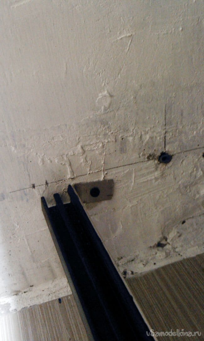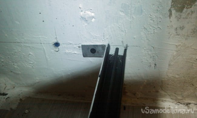 По ним размечется положение поддерживающего направляющую алюминиевого уголка 20х20 мм. Уголок обрезается с учетом загиба в 30 мм, для крепления к стене. Для этого вырезается на уголке нижняя горизонтальная полка. Уголок крепится к стене с двух сторон, посредством дюбелей и саморезов. К кронштейнам Z – образного вида, уголок крепится винтами с головкой в потай.