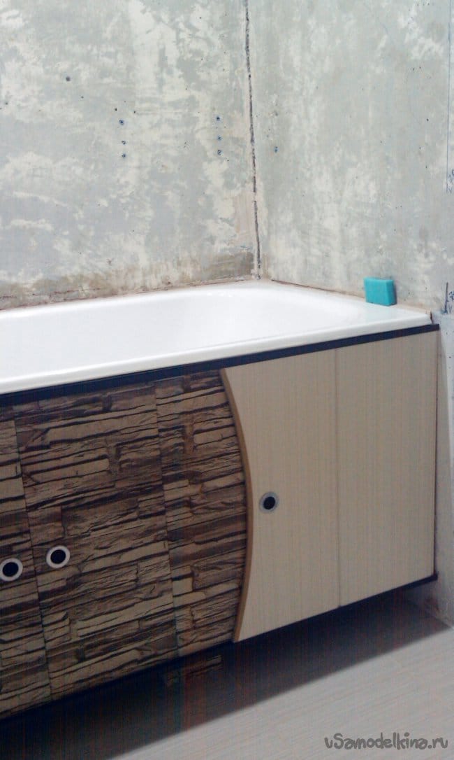 Вот так мне удалось решить вопрос использования пространства под ванной. Под ней хранятся в основном тазики и ведра. Самое главное - жена довольна.