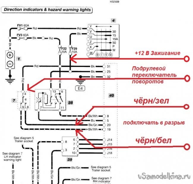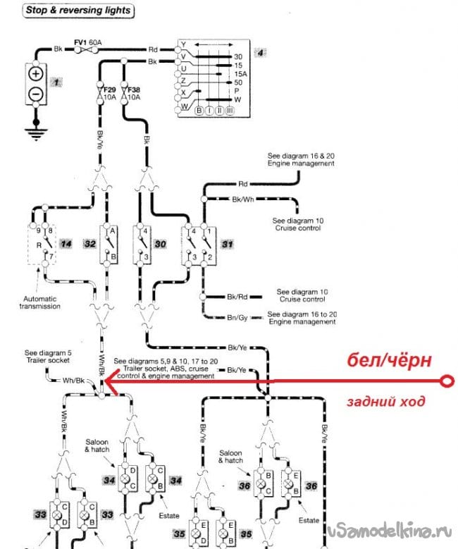 Питание схемы от зажигания (обозначается на схемах как клемма 15), сигнал заднего хода в левом пороге водителя провод бел/черн. Клеммы обозначенные А1-А2, В1-В2 на схеме подключаются в разрыв проводов, идущих от подрулевого переключателя поворотов. Массу берём под штатным болтом на кузове за приборной панелью или в любом удобном месте.