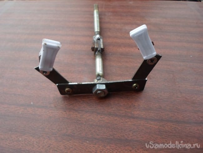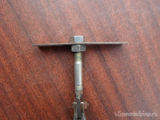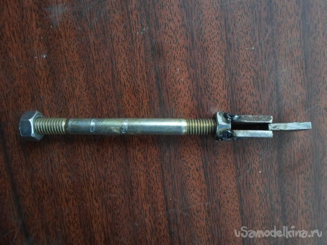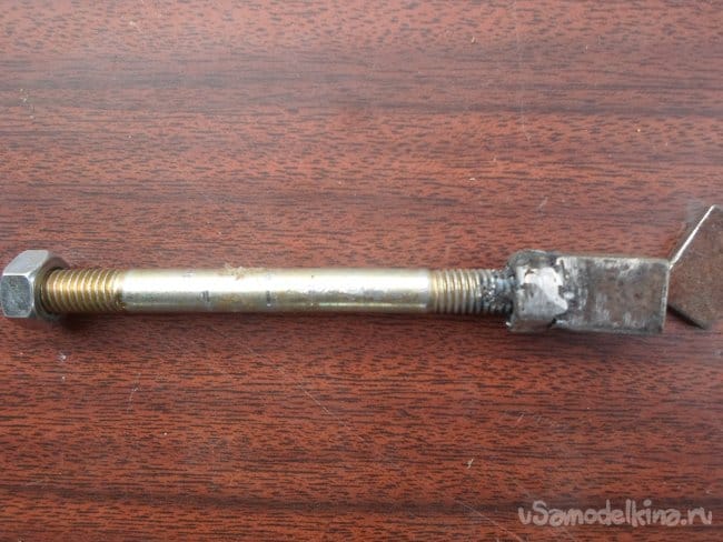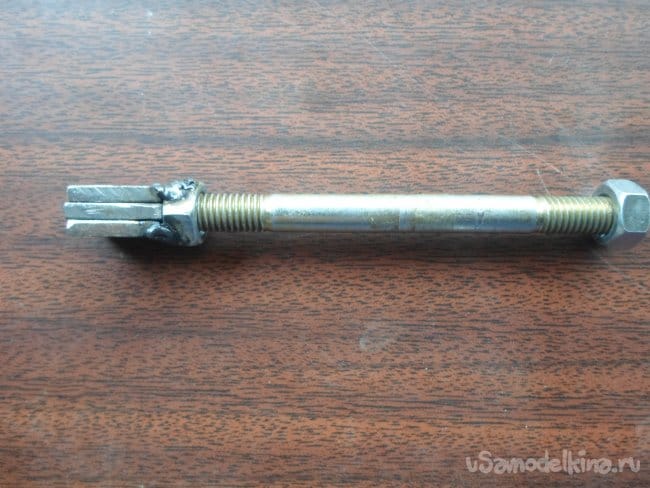 Следующим шагом берём на шпильку длиной 100 мм накручиваем гайку и привариваем заготовки по краям размеры которых 17 * 20 мм, зажав между них третью заготовку ( её приваривать не нужно! )