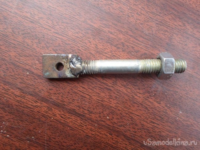После того, как отверстие просверлено, берём и к пластине, которая подлиннее привариваем короткую шпильку. Приварить нужно ровно.