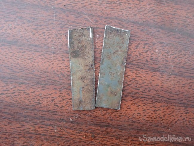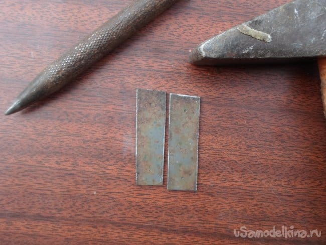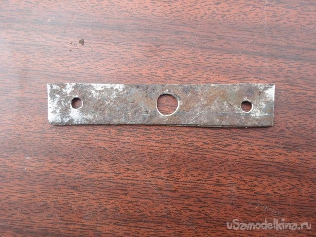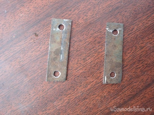 Далее из той же стали толщиной 2 мм выпиливаем две вот такие заготовки, размеры которых 20 * 45 мм, накерниваем и сверлим отверстия на 4 мм