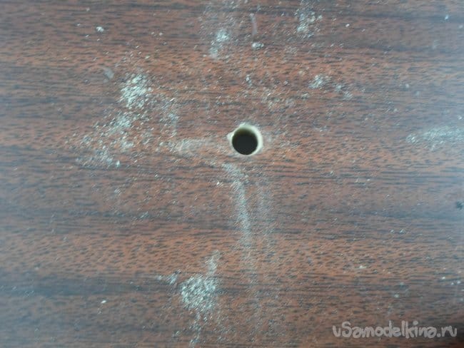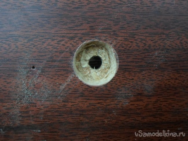 Для закрепления третьей руки берём отступаем от края 7 - 8 см и сверлим отверстие на 8 мм с другой стороны расширяем отверстие до 20 мм, это нужно для того, чтобы гайка вошла в дерево