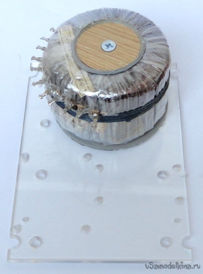Блок выпрямителей и модуль преобразователя крепятся на стойках высотой 10мм под винт 3мм. Силовой трансформатор крепится с помощью винта и стоек 6мм. Подложка трансформатора выполнена из самоклеющейся основы для мебельных ножек.