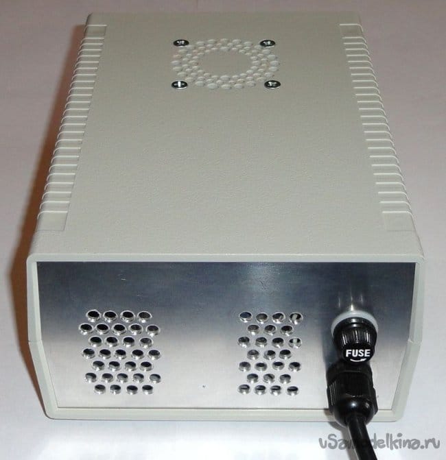 Сетка вентилятора высверлена прямо в корпусе. На задней панели вентиляционные отверстия расположены по бокам от трансформатора. Так как при сборке корпуса трансформатор находится впритык к верхней крышке, то воздушный поток эффективно охлаждает и силовой выпрямитель, и модуль преобразователя.