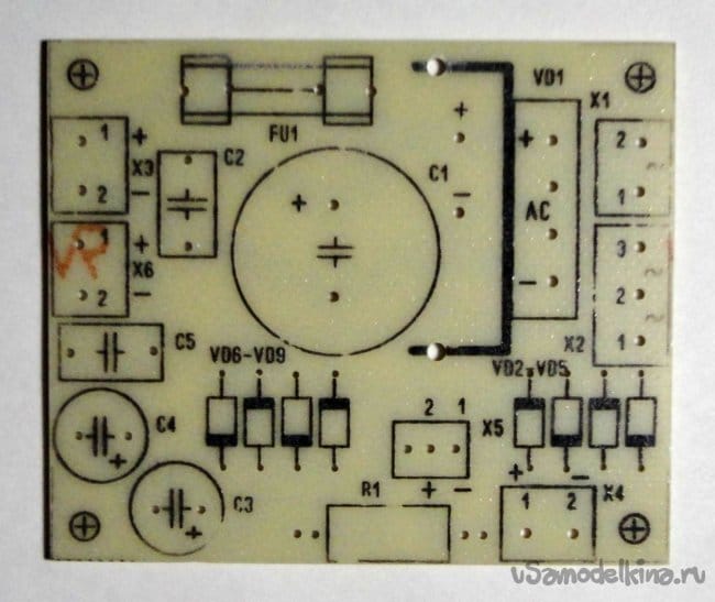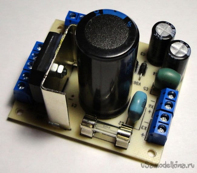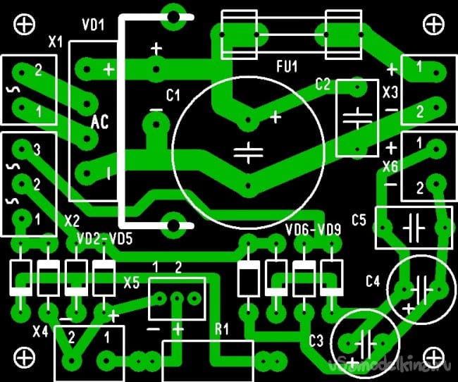 В блоке выпрямителя стоит диодный мост KBU1010 на ток до 10А на небольшом радиаторе. Конденсатор фильтра 6800 мФ на 50В. Для удобства монтажа на плате установлены клемники и разъем для вентилятора (из компьютерного хлама). Так же на плате установлен предохранитель (с целью сберечь трансформатор т.к. модуль DC-DC допускает регулировку до 9А). Резистор R1 служит для снижения, при необходимости, оборотов вентилятора. У меня в конечном итоге поставлена перемычка. Размер печатной платы 55х66мм (см. фото).