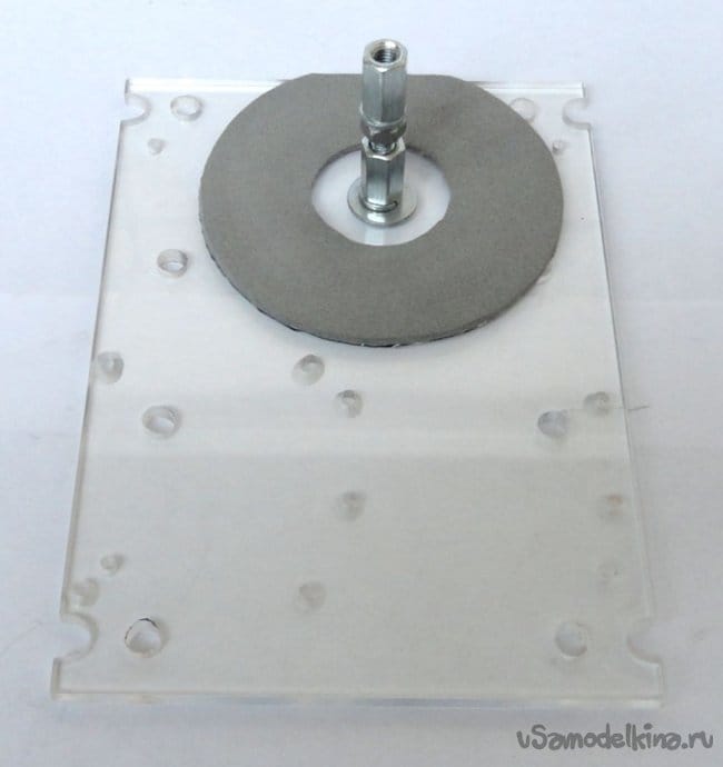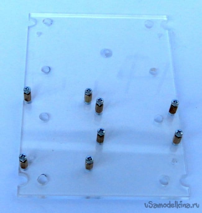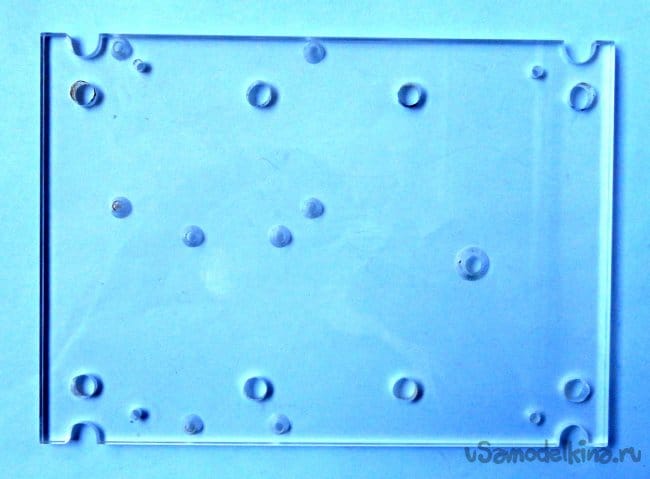 Для того чтобы не делать в корпусе лишних отверстий, основные элементы конструкции крепятся на установочной панели из прозрачного оргстекла 125х175мм толщиной 5мм. Установочная панель крепиться к нижней части корпуса четырьмя винтами с резьбой М3.