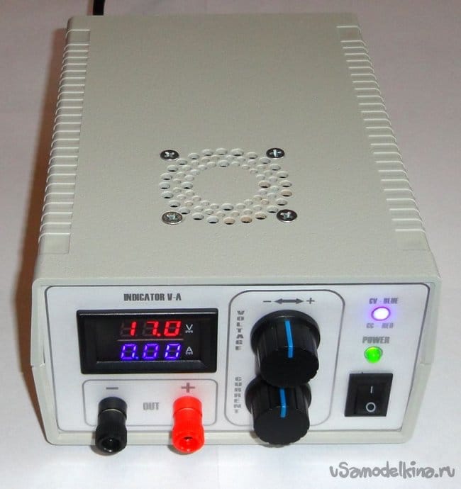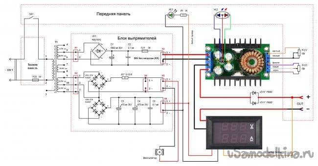Силовой трансформатор в диапроекторе обеспечивает долговременное питание лампы КГМ 24х150 то есть отдает 6,25А при 24В и имеет удобные дополнительные обмотки. Напряжения на обмотках указаны в режиме холостого хода. Поэтому все остальное подбиралось под него. Включение китайских модулей типовое, согласно схемам, указанным на сайте продавца (Aliexpress). Питание модуля ампер-вольтметра осуществляется от отдельного выпрямителя с конденсаторами фильтра. Провод измерения напряжения белого цвета (на схеме он рыжего цвета). С модуля понижающего преобразователя DC-DC CC/CV выпаяны подстроечные потенциометры и в место них на переднюю панель выведены регулировочные. У меня временно стоят обыкновенные регуляторы, но далее будут установлены многооборотные (места на панели и в корпусе рассчитывались именно под них). Так же выпаян индикаторный CC-CV двуцветный светодиод HL2 и с помощью маленькой платки, на которой установлен и светодиод HL1 «POWER», выведен на переднюю панель. Диоды VD10, VD11 можно установить в случае использования ЛБП в качестве зарядного устройства. Они служат для блокировки обратного тока. У меня они пока не установлены, но платка изготовлена (на случай необходимости), на которой установлены диоды P600D (каждый диод рассчитан на ток до 6А).