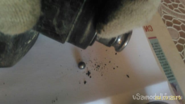 Но для этого он должен свободно двигаться в своем посадочном месте. В моем перфораторе свободно двигаться шарику не дает скопившаяся грязь и старая засохшая смазка. Чтобы убрать грязь и почистить внутренности патрона надо вытащить шарик. Для этого берем перфоратор таким образом, чтобы шарик оказался снизу. Надавив на фиксирующую шайбу сжимаем пружину и шарик сам вываливается на стол.