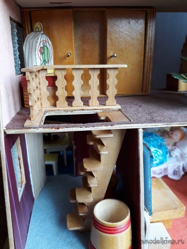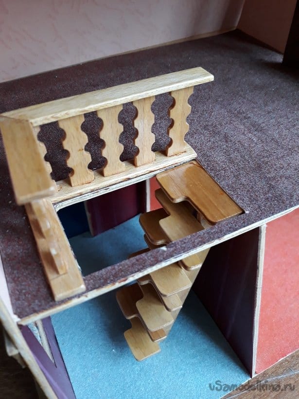 Внутри домика организуются похожие перила для ограждения лестницы на второй этаж. Перила там угловые, собираются они отдельно. А, потом уже ставятся на место.