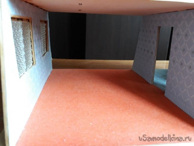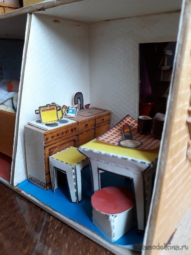Вы уже обратили внимание на внутреннею отделку, поскольку она присутствует на фотографиях приведенных выше. Ну, не разбирать же дом, что бы рассказать о его постройке. Для убранства использовались кусочки старых обоев, цветная бумага для детского творчества. Особенно пригодилась бумага с ворсистым напылением, ну прямо как раз для паласов в доме. Тут уже все согласовывалось с хозяйкой. Где-то мебель помог сделать я, где-то она (дочка) нашла и склеила из бумаги. Не большая экскурсия по дому.