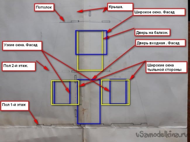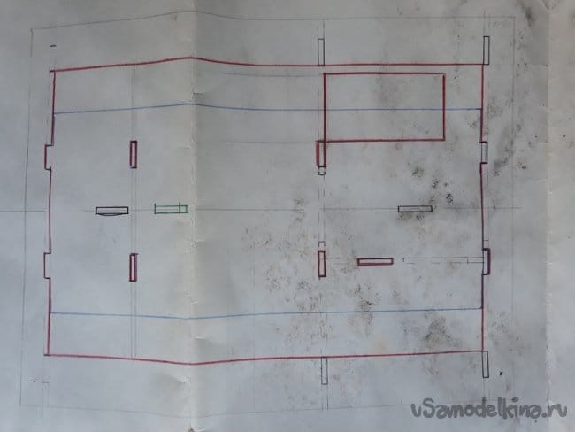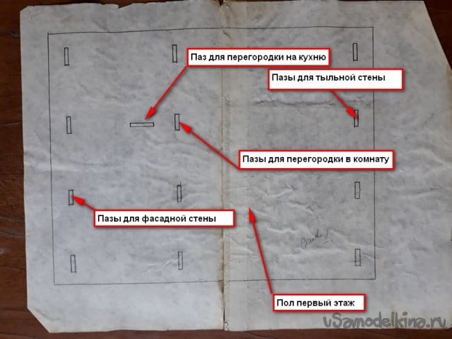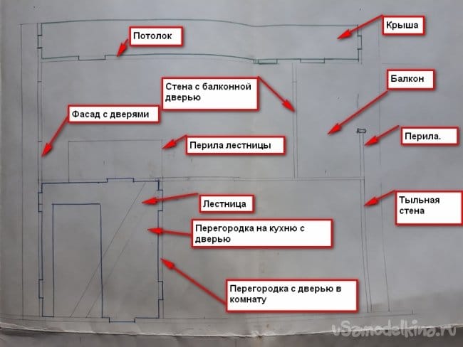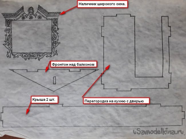 Детали - фасад с дверями, тыльная стена и стена с балконной дверью лучшей стороной ориентируются наружу. По этим сторонам производится разметка, полос параллельных основанию дома, миллиметров через 6-7. Кому как нравится. Затем ножом делаются прорези по разметке, которые имитируют обшивку стены из досок.