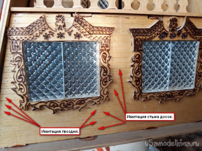 Конечно, наличники на окна и двери дополняли сказочный облик. Как выполнялись наличники на двери и окна, наверное, вы уже поняли. Создав рисунки для наличников окон и дверей, я перевел их на фанеру и прибором для выжигания проявил рисунок. Затем выпилил лобзиком и вскрыл лаком.