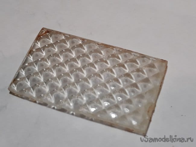 Далее, переходим к изготовлению стекол к окнам. Их тоже можно выполнить по-разному. Сделать прозрачными или имитировать занавески на окнах. Я, остановился на оргстекле от плафонов дневного света. Оно имело с одной стороны ровную поверхность, а с другой стороны рельефную.