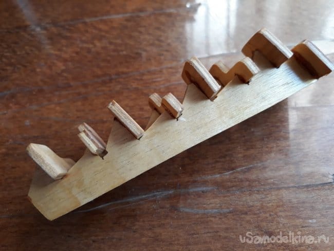 Далее, балкон. Он практически готов, необходимо сделать только перила и укрепить их. Перила изготавливаются из ученических линеек. Размеры берутся с учетом наклона крыши домика. По этому, по низу балкона получаются не большие зазоры. Но, они не портят внешнего облика .