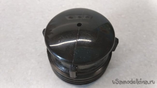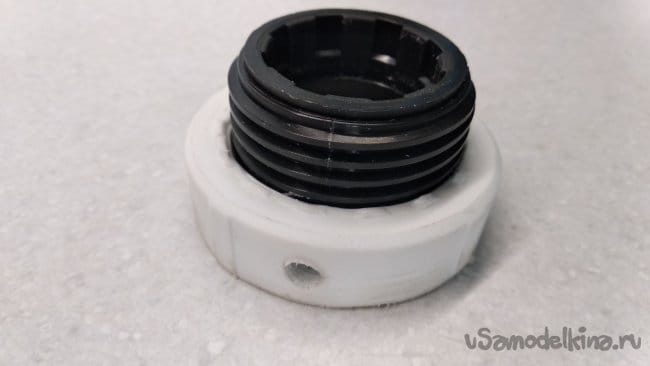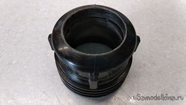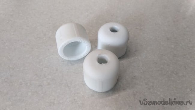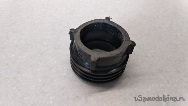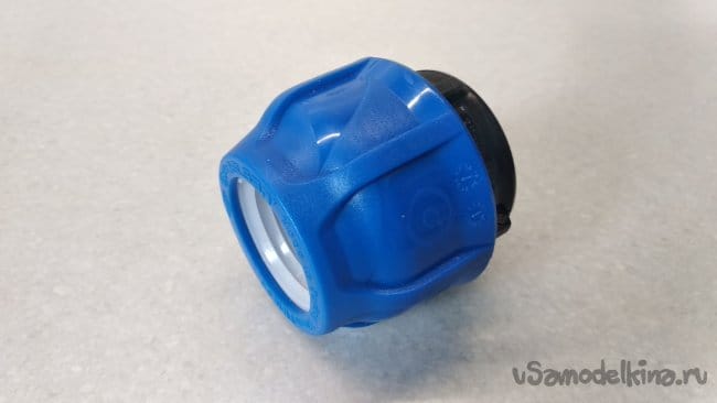 Торец второй заглушки ПНД 32 полностью срезать, убрать резиновое кольцо, а внутренний диаметр белого конического кольца слегка загладить шкуркой средней зернистости.
