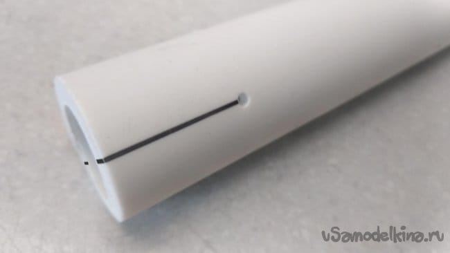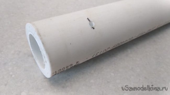 С одной стороны полипропиленовой трубы (ПП 32), на расстоянии 30 мм. от её края, разметить и просверлить сквозное отверстие (на весь диаметр трубы) Ø 3 мм.