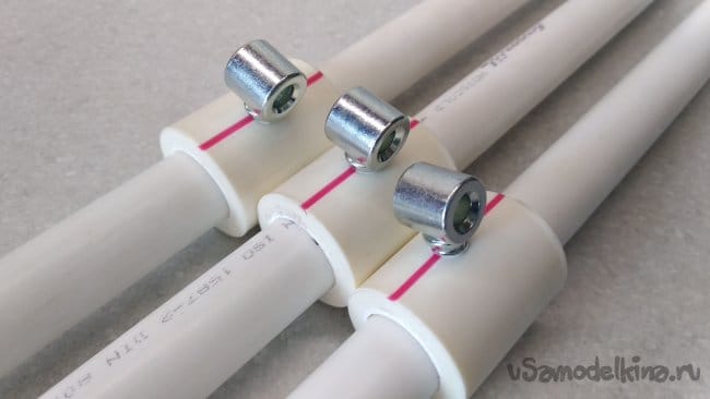 Ввинтить до упора три из них в приготовленные «полурезьбовые» отверстия в средних частях труб для «ног».
