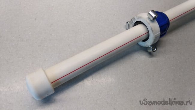 В центре одной из заглушек ПНД 32, разметить и при помощи перового сверла сделать отверстие Ø 32 мм., которая затем будет использована для изготовления резьбового (цангового) фиксатора центральной телескопической штанги.