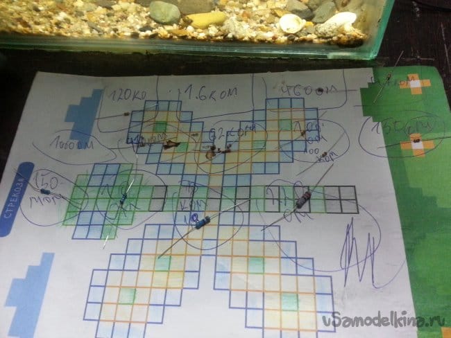 Для начала вставляю все резисторы по своим местам, с обратной стороны просто пока загибаю. Набор реально конструктор. На плате все написано, так что сборка не отняла ни сил, ни много времени. Мне даже понравилось.