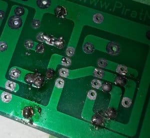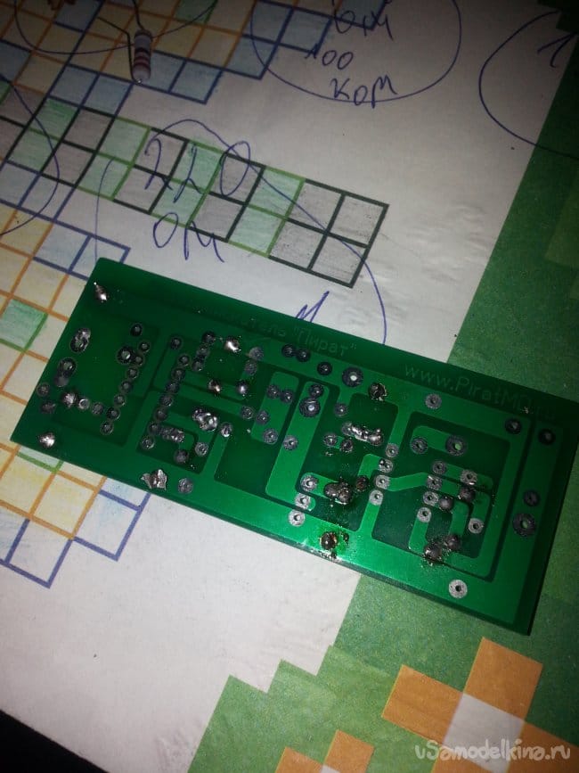 После установки резисторов на свои места, с обратной стороны припаиваю обработав место пайки паяльной кислотой, стараясь сильно не греть элементы около двух секунд максимум три.