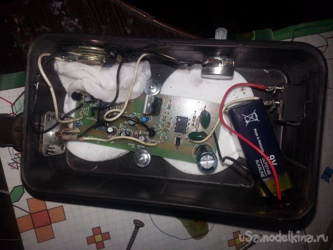 Для готовой платы подобрал коробочку от саморезов очень удобная, плотно закрывается и места хватает, установил все в неё, питание у меня 9вольт крона варта, в режиме работы кроны хватает на 10, 12 часов. На деле друг две недели по часа три, каждый день собирал металл, крона только начала садится.