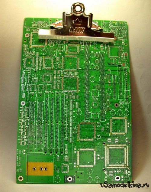 Чтобы сделать держатель для бумаги из старой материнской карты Вам необходимо отделить от нее все лишние части (когда-то они были совсем нелишними). Взять стандартный держатель для листов и отделить от него сам механизм. Затем при помощи клепок или маленьких болтиков закрепить его на плате. Ах, да, чуть не забыл – если на «материнке» остаются какие-то зазубрины, то их можно обработать напильником. Учтите, что плату под листы А4 вы вряд ли найдете, а вот формат Letter – это то, что Вам нужно.