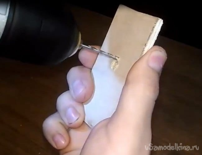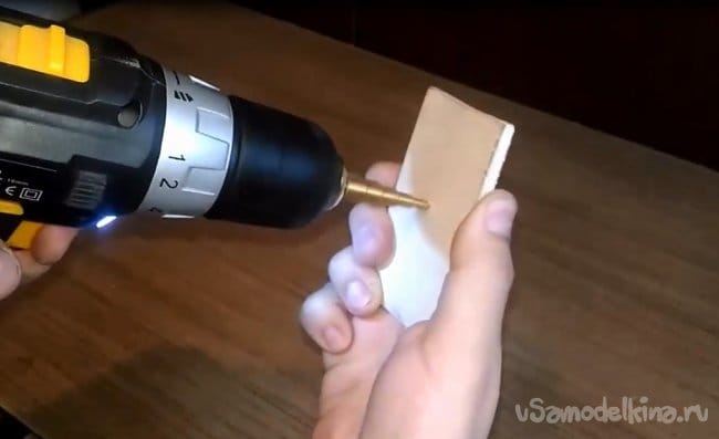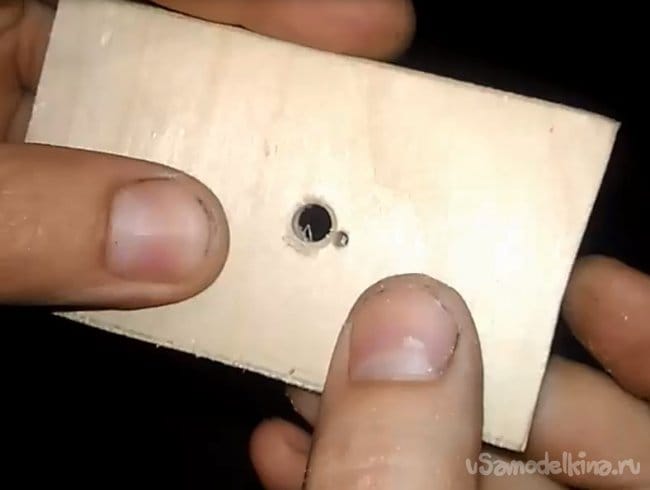 Первым делом просверлим в кусочке фанеры примерно по центру отверстие диаметром 6мм