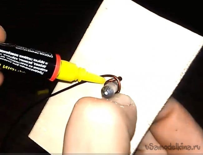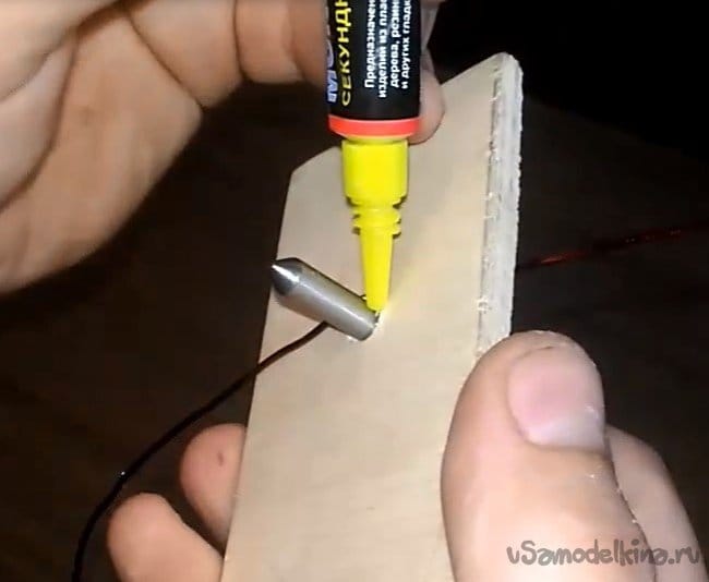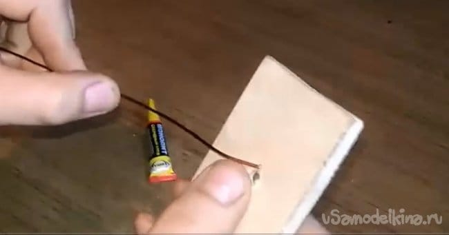 В другое отверстие вставляем направляющую (гвоздь 6мм) и фиксируем клеем
