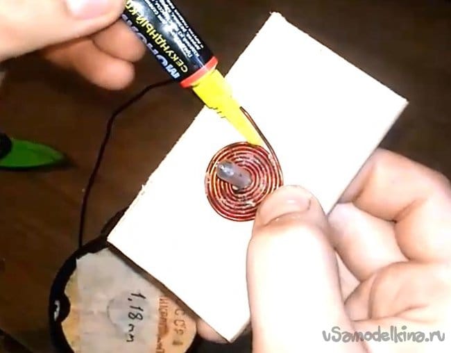 Начинаем наматывать провод, постепенно получаю плоскую катушку и через каждые 2-3 витка фиксируем клеем