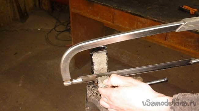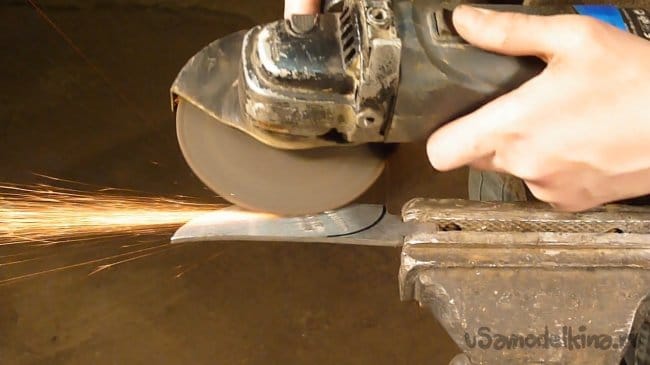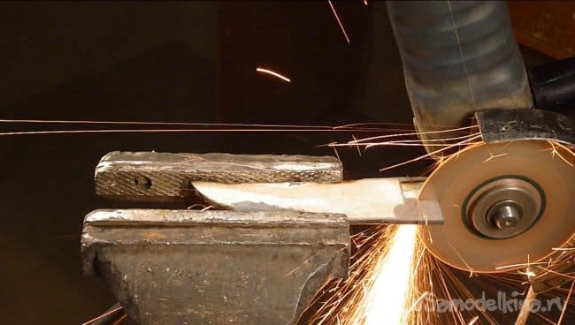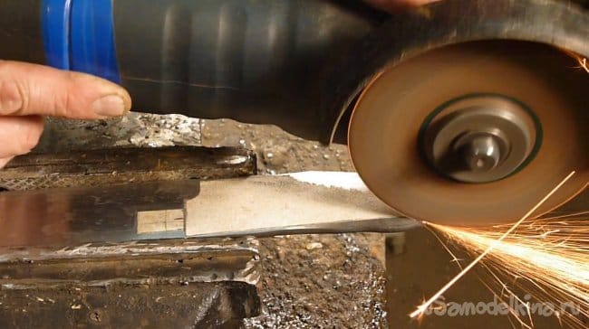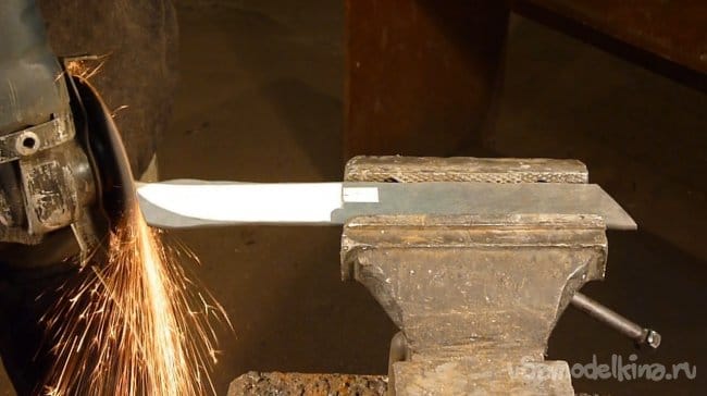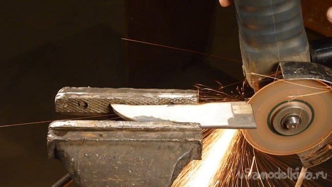 Из бумаги вырезали шаблон клинка, наклеили на заготовку и вырезали при помощи болгарки.