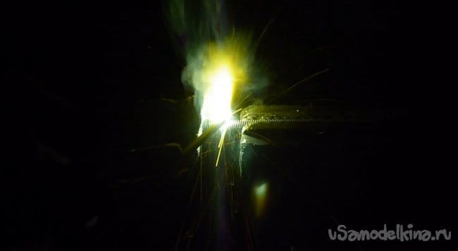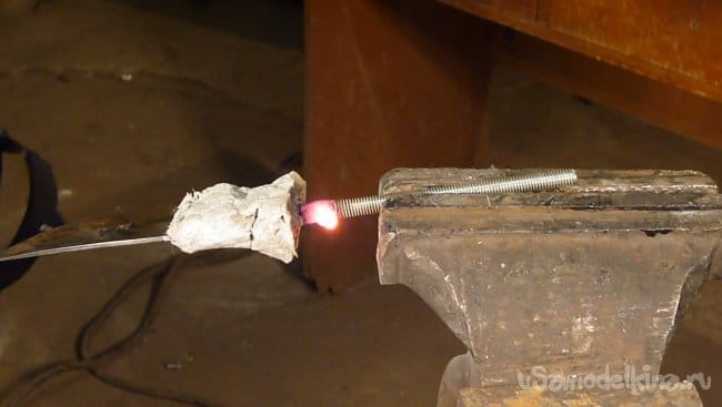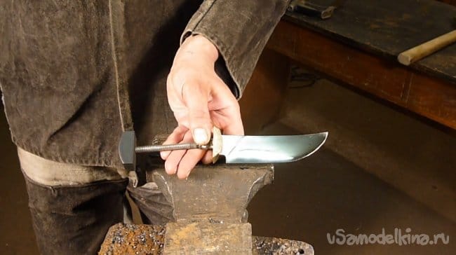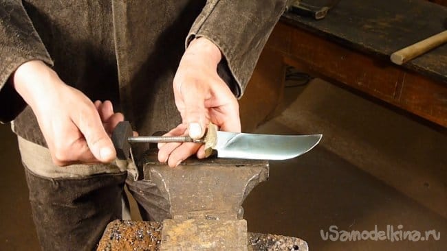 В шпильке М8 сделали прорезь и приварили к хвостовику, предварительно закрыв больстер и клинок мокрым асбестом.