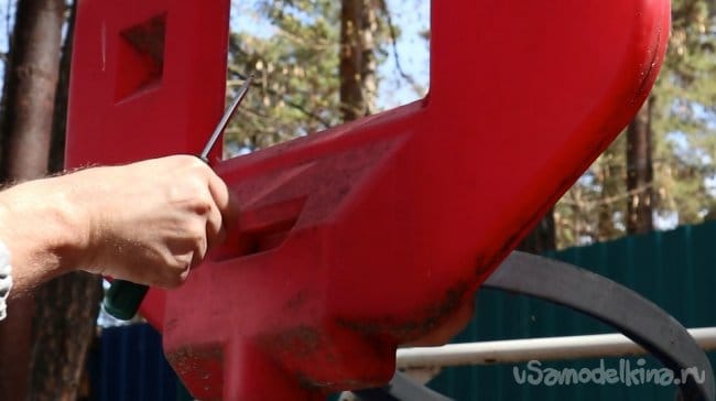 Разбираем старое кольцо. От него остаются только, собственно, само кольцо, сетка и винтики. Старый щит однозначно на переработку (если бы она у нас в стране была бы...), трубу и подставку-резервуар могу подарить, если кому нужно - не люблю лишний раз выбрасывать пластик
