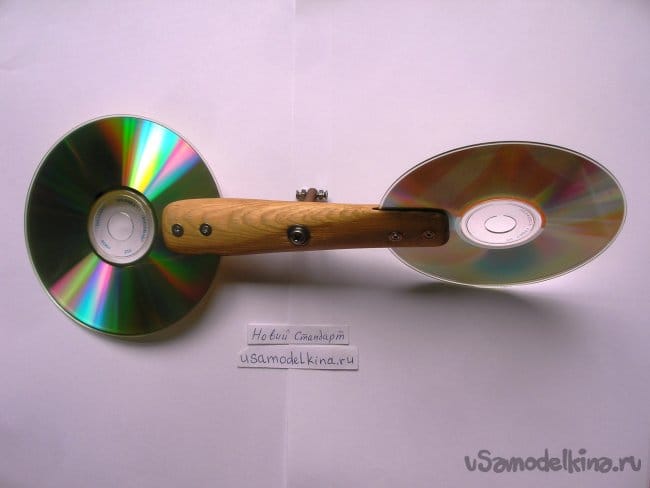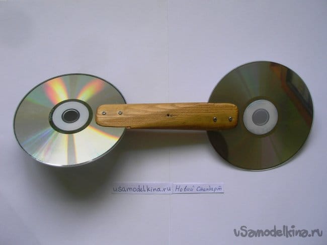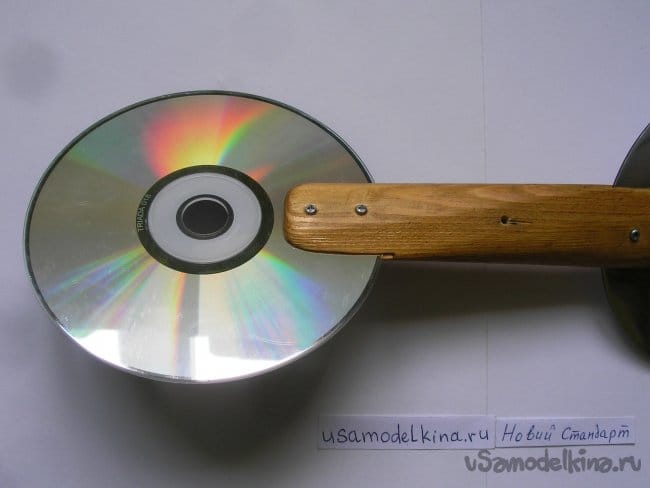 Этап 3. Основу винта при желании можно покрыть водостойким лаком или краской. Сверлим отверстия в планке под крепление винтиками СиДи, потом вставляем диск и попадая в отверстия сверлом сверлим и диски, после чего прикрепляем их винтиками.