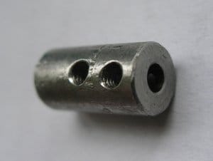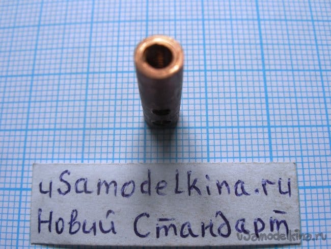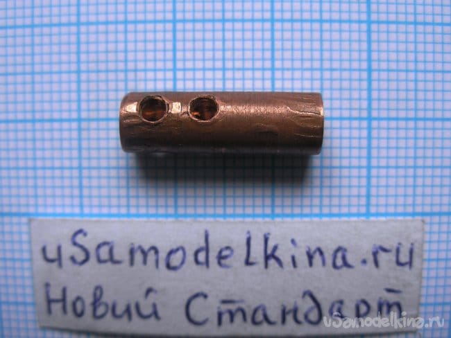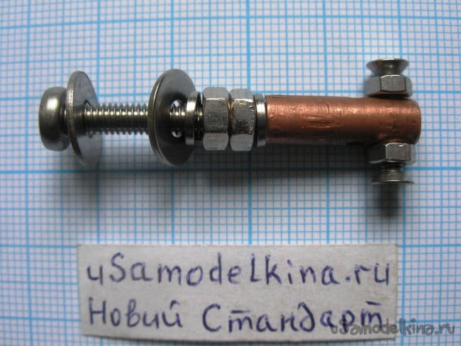Этап 5. Для соединения воздушного винта с валом генератора делаем с медной трубочки соединительную муфту. Внутри муфты резьба М3 (половина длинны трубки). Для предупреждения вращения винтика М3 в муфте извне ставлю контргайку и ключом затягиваю ее к муфте. Вторая половина отверстия внутри медной трубки без резьбы, соответствует диаметру вала генератора. Чтобы вал не высовывался фиксирую его 2 или 4-мя винтиками М3 без шляпок. Предварительно просверлив 4 отверстия и нарезав резьбу М3 перпендикулярно оси трубки.