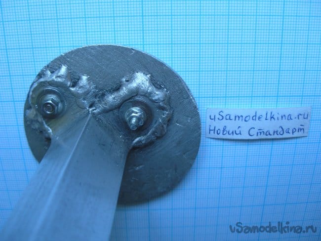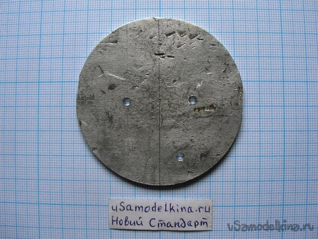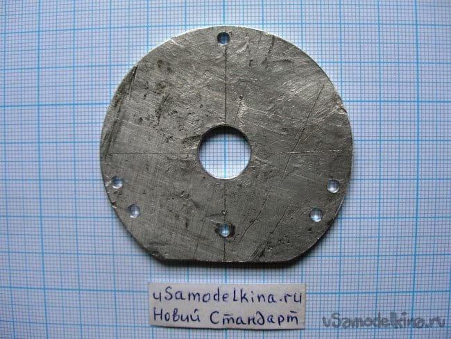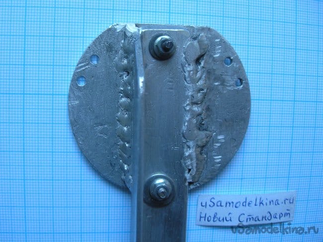Этап 7. Тем временем с дюралевой пластинки вырезаю 2 кружка один под диаметр генератора. Соединить кружки с уголком можно и винтиками, но я приварил. Другой кружок для крепления к стене дома там есть отверстия под шурупы.
