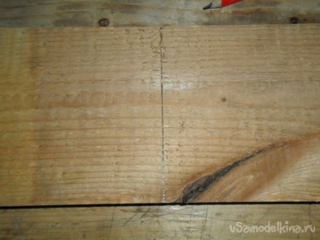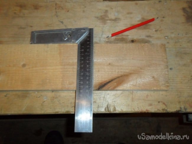 Нам необходимо отпилить лишнюю часть сосновой доски. Чтобы плоскость торца после очерчивания карандашом по угольнику и спила была перпендикулярна плоскости кромки, последнюю обрабатываем на фуговальном станке. Проводим карандашом вдоль угольника так, чтобы сучок остался за пределами нужной части доски. В стусле распиливаем доску. После этого фугуем получившуюся длинную часть заготовки. Обработанную доску вновь кладем в стусло и пилим со стороны неровного торца. Конечно, можно было и сразу отфуговать всю доску, а потом отпилить лишние части. Но поступив так, как описано выше, мы тем самым сэкономили электрическую энергию, затрачиваемую на работу станка, и попутно сохранили заостренность ножей фуговального вала. В столярном, как и в другом многосложном, деле важна повышенная рациональность.
