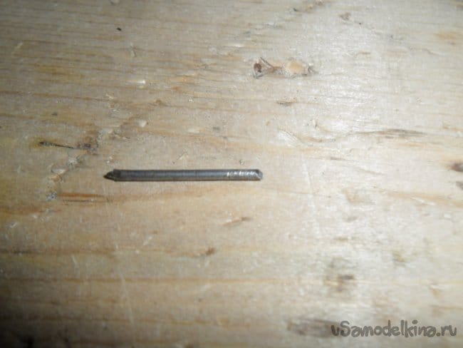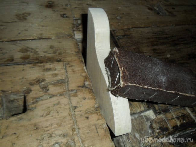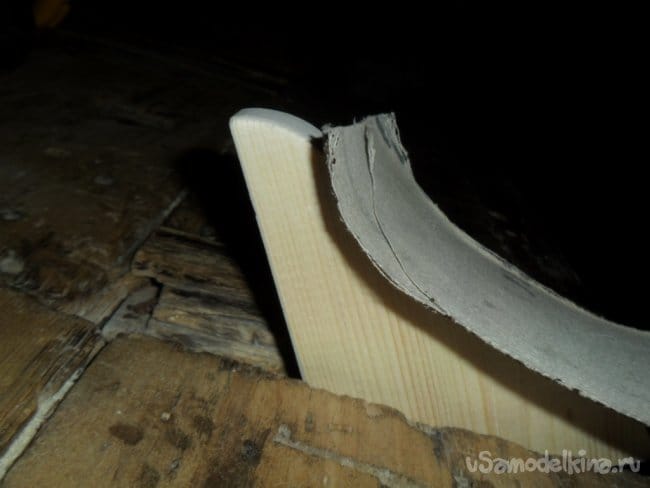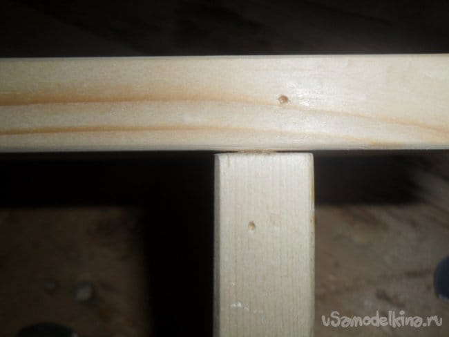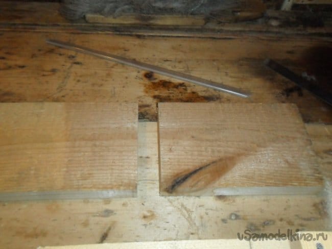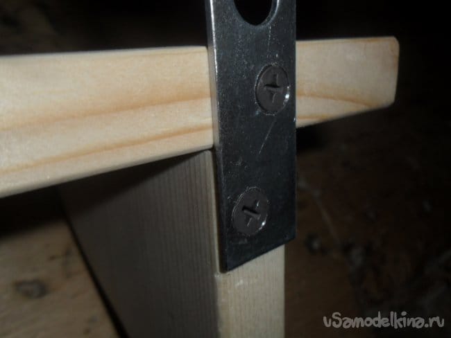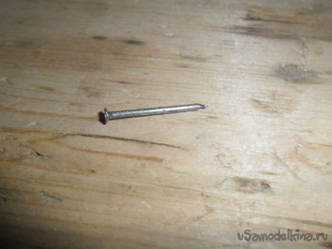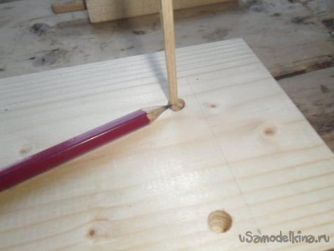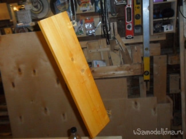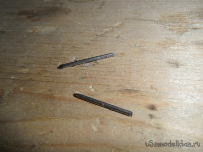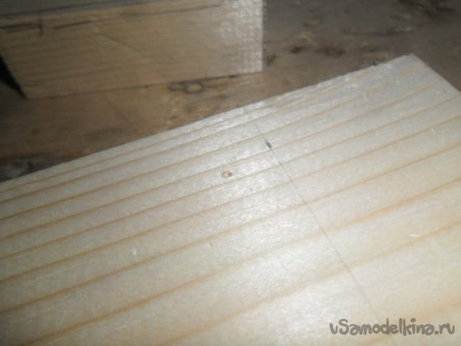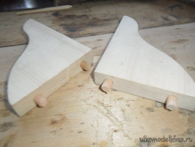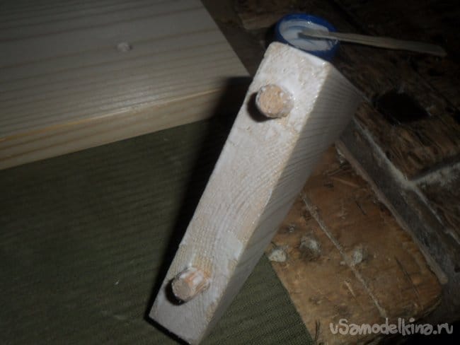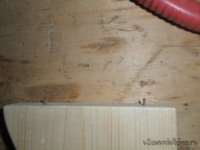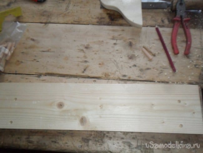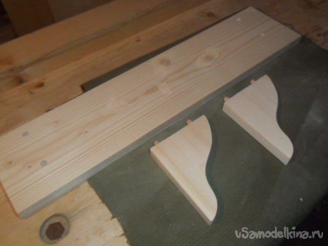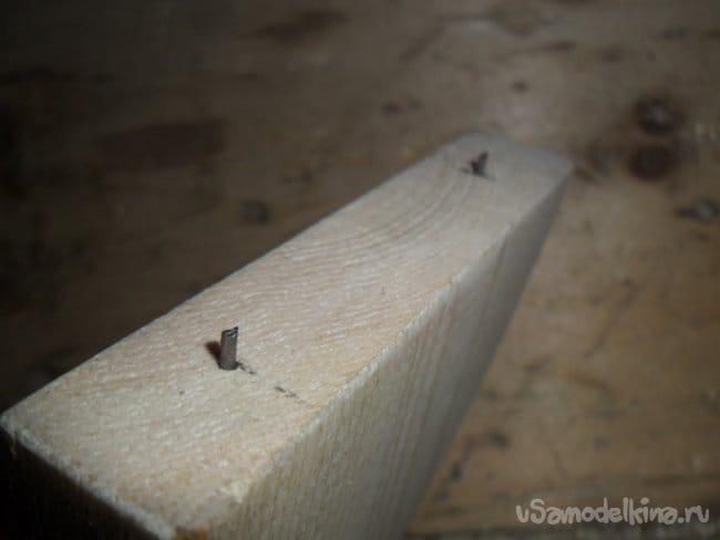Большая доска и кронштейны будут крепиться друг к другу при помощи шкантов и столярного клея. Чтобы шканты точно совпали с отверстиями при соединении всех деталей, следует наметить места расположения для первых. Делается это следующим образом. Берем два небольших гвоздика и «откусываем» от них пассатижами шляпки. Затем вставляем (вбиваем) металлические стержни в упор так, чтобы сверху они выступали не менее чем на 3 мм. Взяв кронштейн, аккуратно приставляем его к нижней части длинной доски по линии и слегка прижимаем. Так мы получили углубления-метки. Вынув гвозди без шляпки из первого упора, вставляем их во второй и приставляем так же к доске.