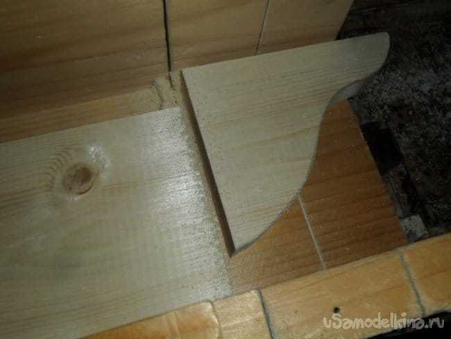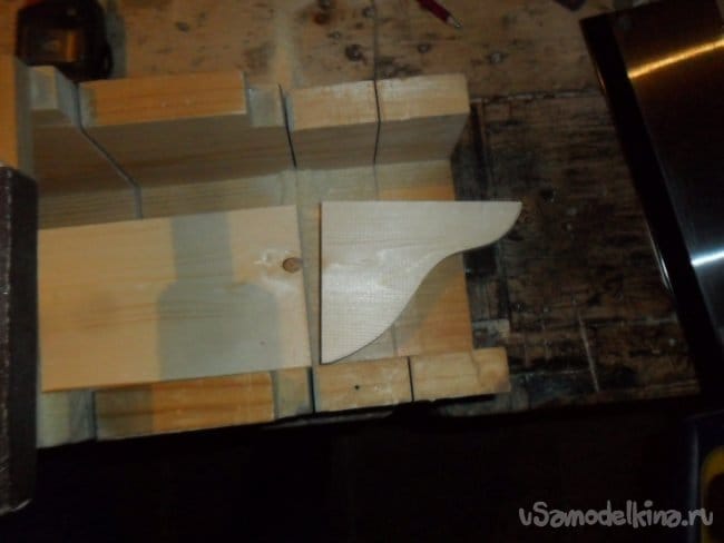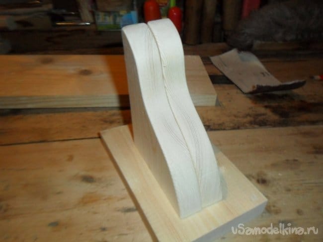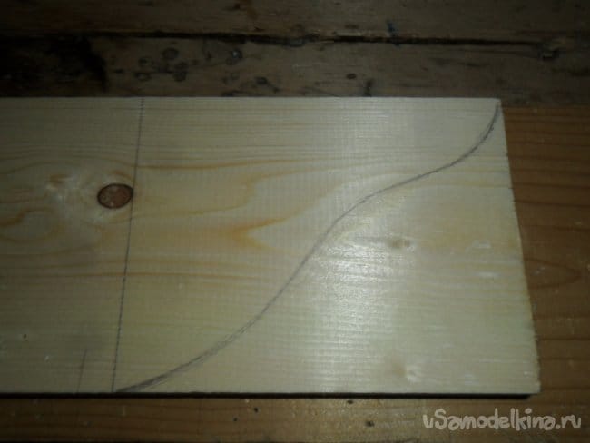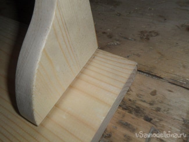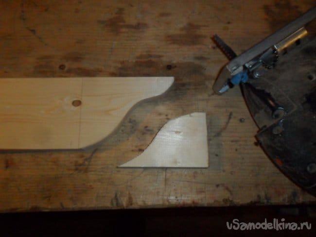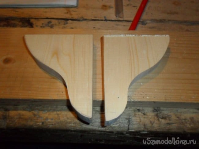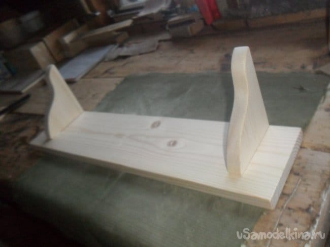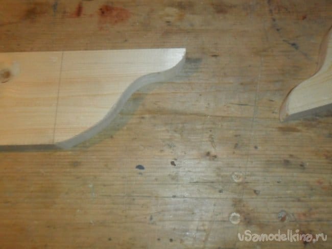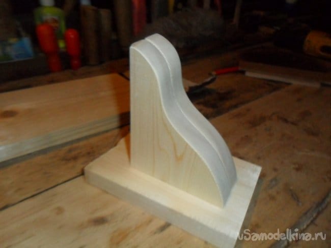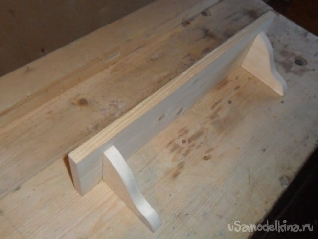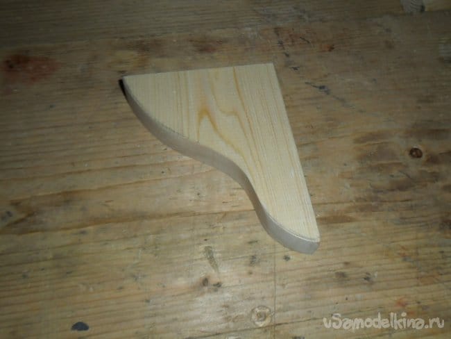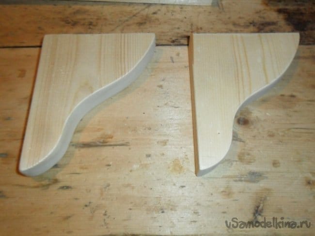 Главная часть полки будет опираться на деревянные кронштейны. Форма передних торцов у них будет волнообразная. Выбранную нужную доску обрабатываем на станке. Затем рисуем плавно изменяющуюся кривую линию. Электрическим лобзиком отпиливаем ненужную часть. Затем в стусле пилим по другой – прямой – линии. В результате получился первый кронштейн. Приставив его к доске, обводим карандашом по контуру и проделываем те же две операции, что и при изготовлении первой опоры. Получились две детали длиной 11,5 см и шириной 9 см.
