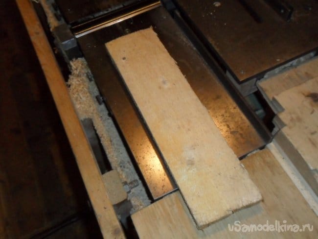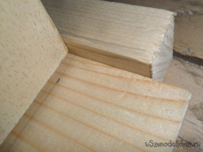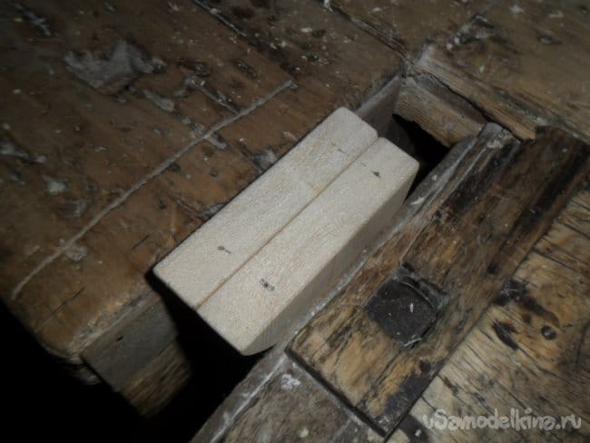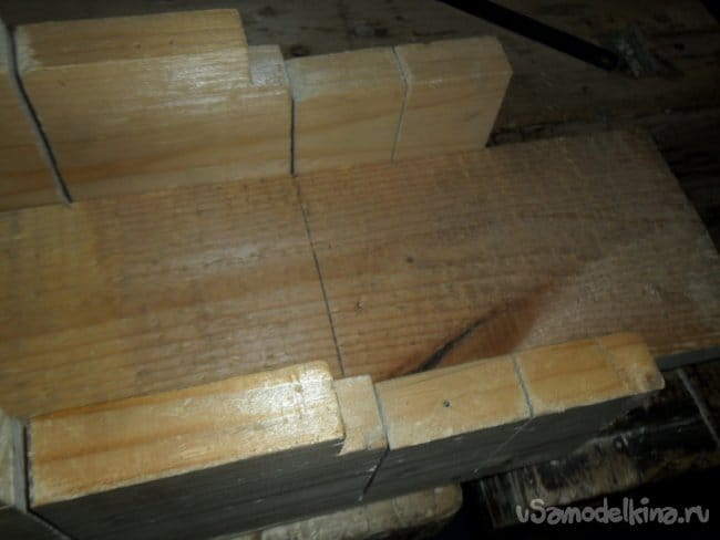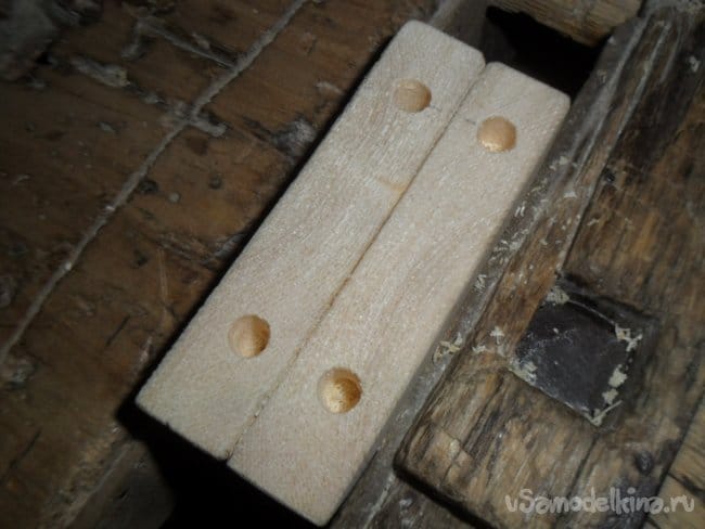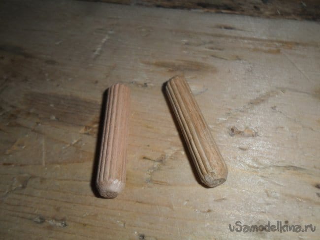 Закрепив вместе в тиски верстака упоры, смазываем столярным клеем отверстия и шканты и вбиваем шипы до их полной «посадки». Измеряем глубину отверстий на доске и переносим размеры на выступающую часть шкантов. После этого пилим чуть ниже отмеченных линий (ниже – для того, чтобы быть уверенным, что шканты свободно и до конца войдут в отверстия). Для проверки правильно выполненной работы соединяем временно кронштейны и длинную доску.