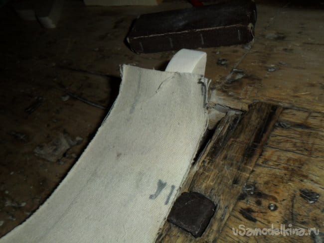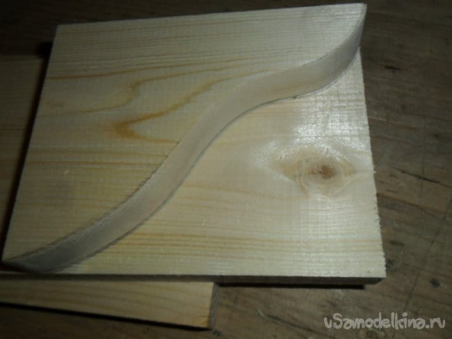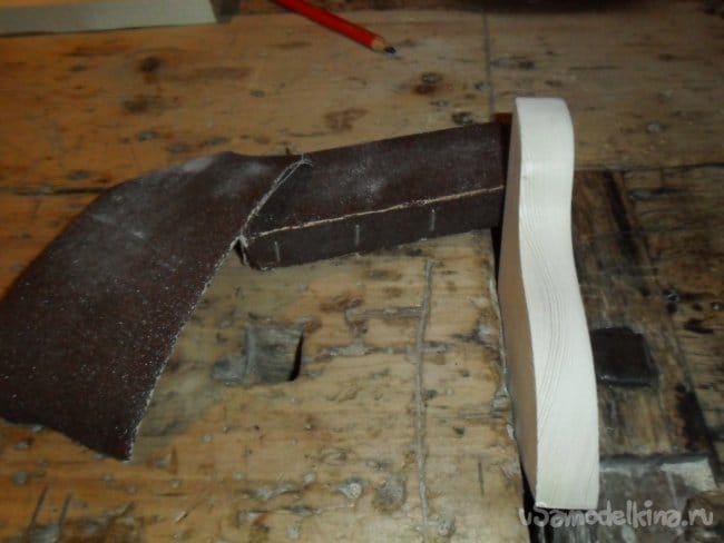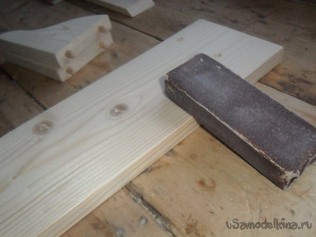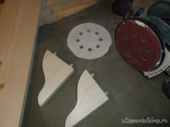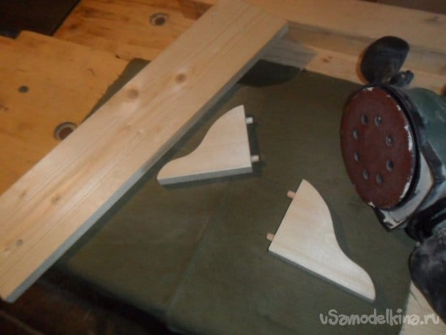 Сначала следует сгладить острые ребра заготовок. Затем приступить к шлифовке криволинейных торцов. Для этого понадобится вдобавок к шлифовальному бруску кусок нефиксированной гнущейся шкурки. Обработав обе детали, ставим их на одну плоскость доски, чтобы проверить, одинаковы ли получились кронштейны. Как видно по фотографии – достаточно одинаковы.