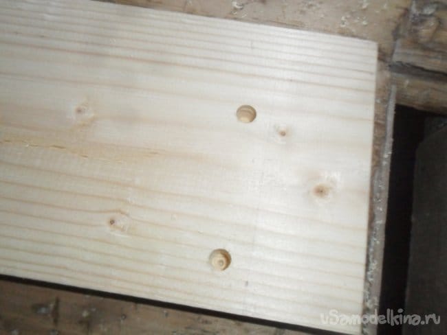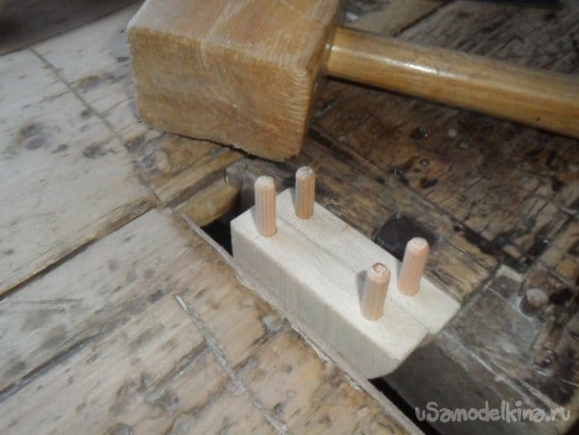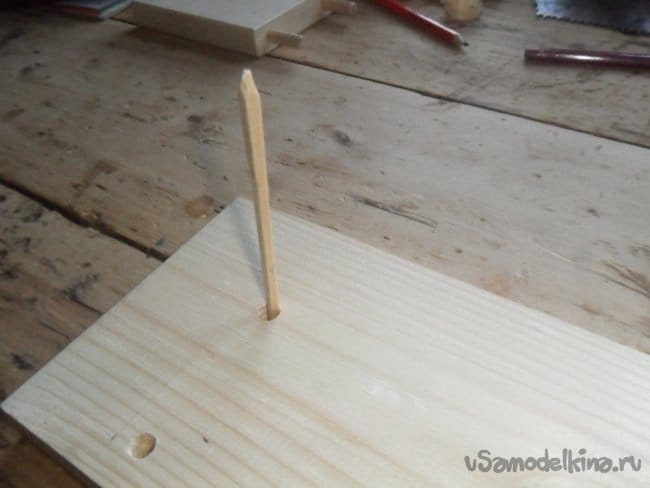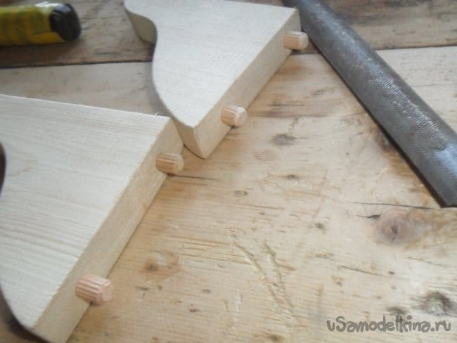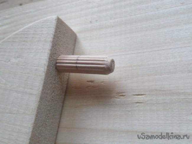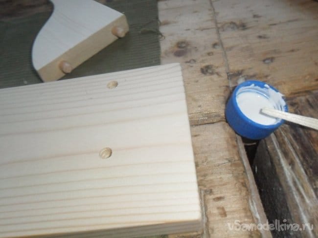 Смазав столярным клеем шканты и отверстия основной доски, соединяем все детали.