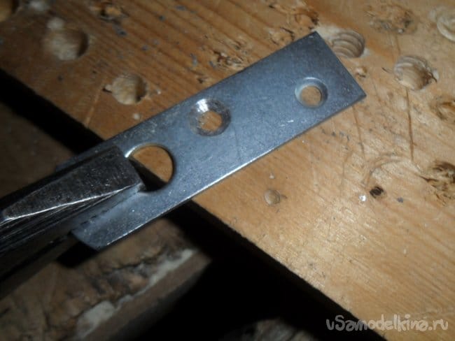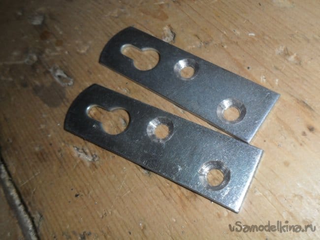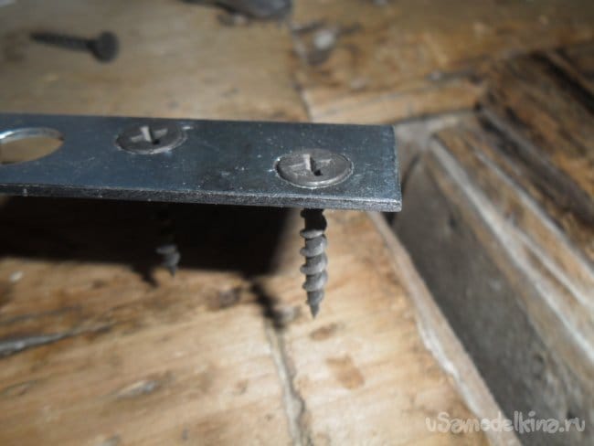 Заводские навески выпущены с недостаточно широкими углублениями для шляпок саморезов. Поэтому следует расширить и одновременно углубить отверстия. Делаем это при помощи сверла, дрели и пассатижей. После сверления вставляем два самореза в отверстия и убеждаемся, что шляпки саморезов располагаются почти на одном уровне с плоскостью навески (такое расположение допустимо). Далее прикладываем навески к полке и помечаем центры их отверстий. В этих местах сверлим небольшие отверстия для саморезов. В завершение установки прикручиваем шуруповертом навески к полке.