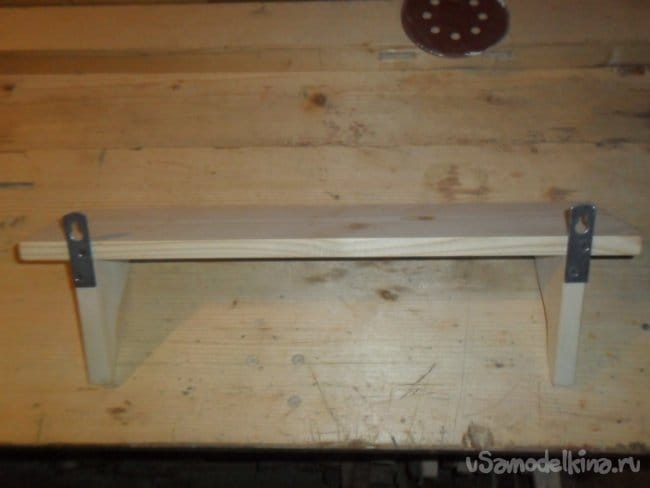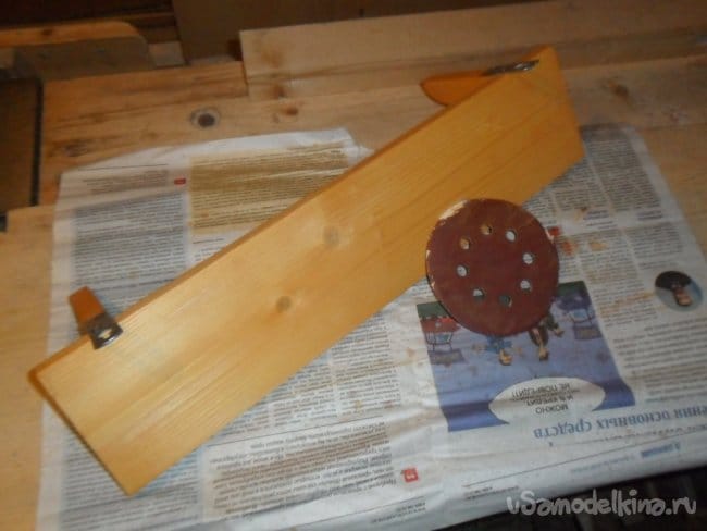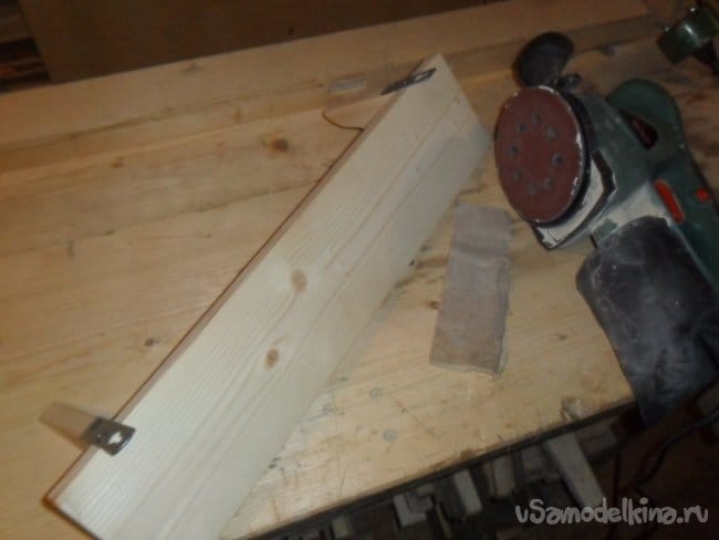 За время склеивания заготовок и крепления навесок полка немного запятналась. Для исправления этого шлифуем ее.