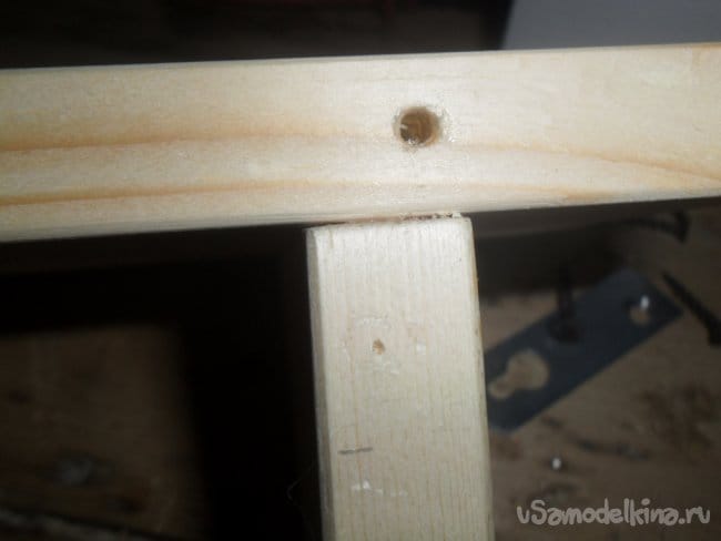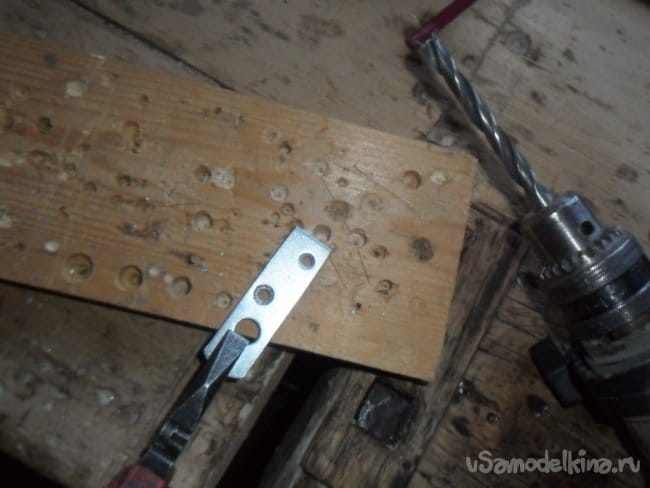 Отмеченные места на кронштейнах и главной доске сверлим с помощью дрели на глубину примерно 1,5 см. Диаметр получившихся отверстий – 8 мм.