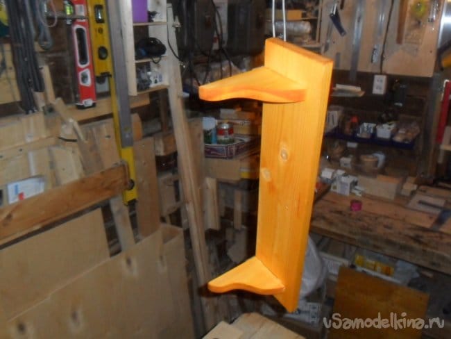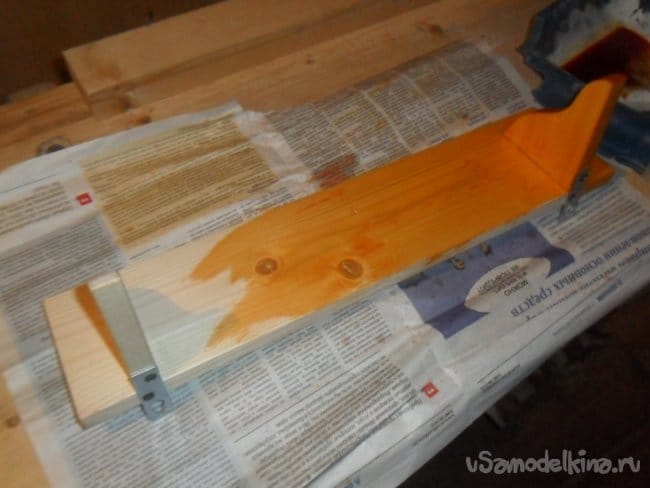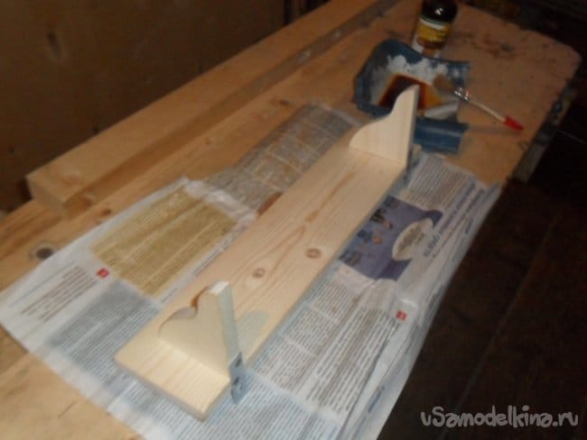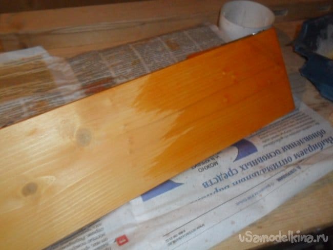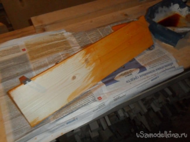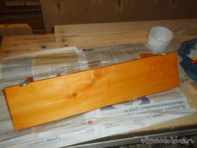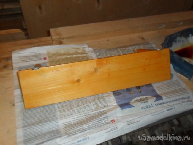 Красим полку морилкой в два слоя. После первого слоя слегка шлифуем изделие мелкозернистой наждачной бумагой.