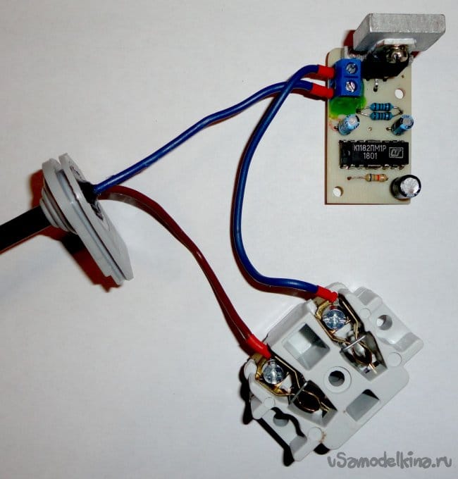 Велосипед изобретать не стал, использовал типовую схему включения фазового регулятора К1182ПМ1Р. В конструкции использованы низкопрофильные конденсаторы от старых видеокарт. Поэтому плата удобно размещается в указанной модели розетки.