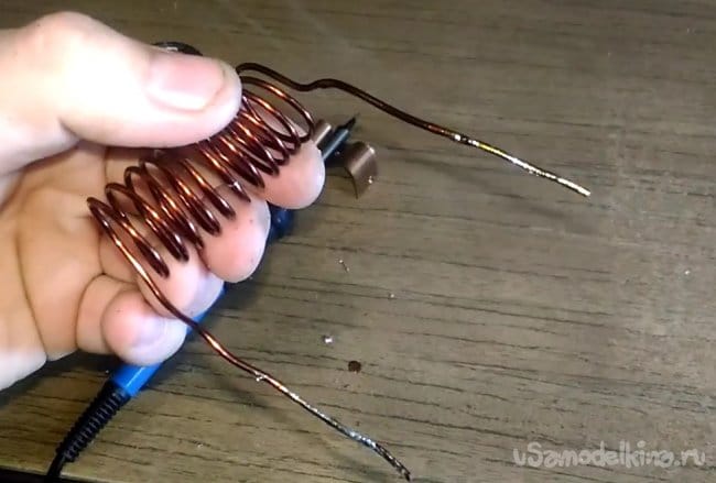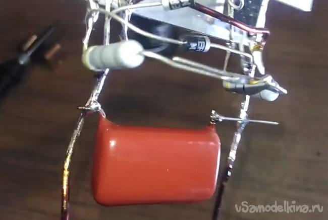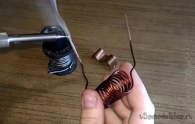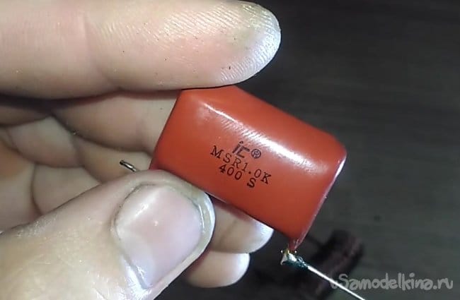Следом нужно припаять конденсатор между катушкой как на фото.